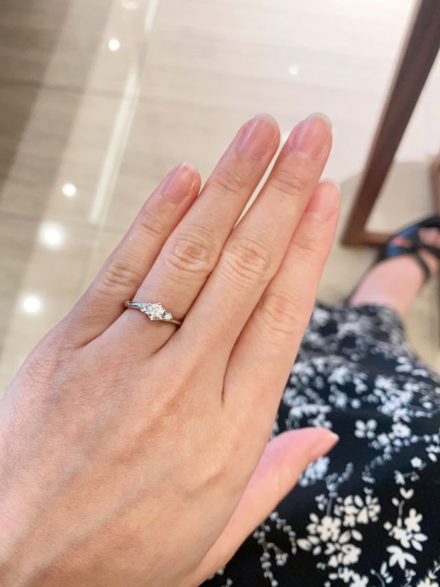 指が5.5号と細身なので、ダイヤの存在感もありつつ、華奢なデザインが自分の指に似合ったので、こちらのデザインに決めました。