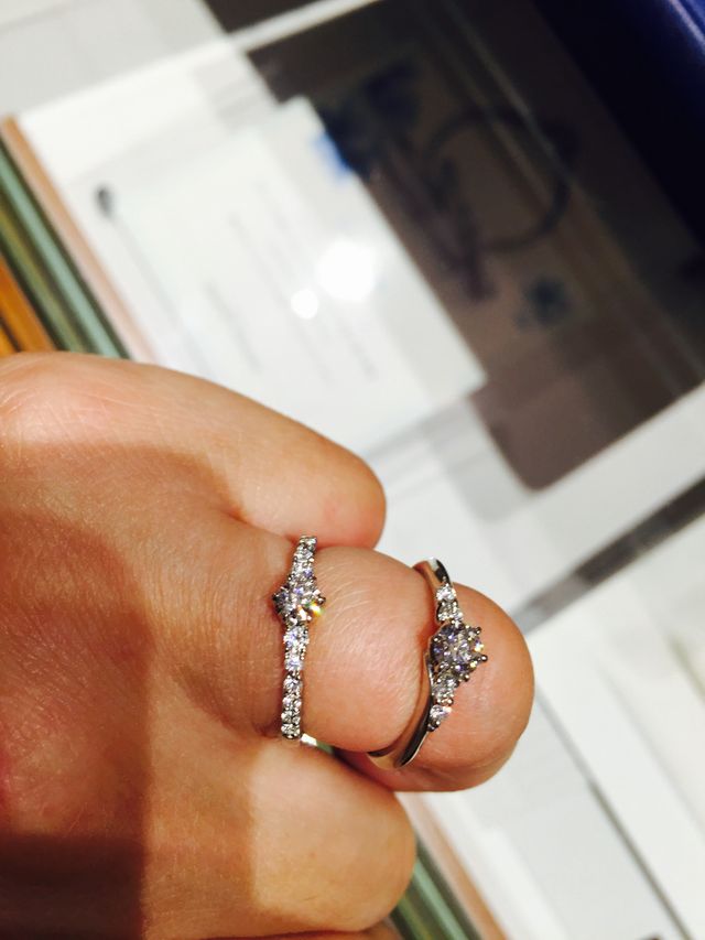 両脇に2つずつダイヤが付いており、とても輝いていた。5種類ほど試着したが華奢なデザインが気に入ったため。また、結婚指輪と重ねづけした時に華やかにかつ上品に見えるデザインであったため、他社も検討していたが1店舗目で決めました。