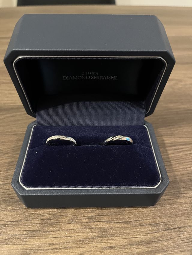 女性用の結婚指輪は細身で輝いています。どこからどう見ても、反射して綺麗です。婚約指輪とセットでつけると最高です。男性用の結婚指輪も輝いています。周りと