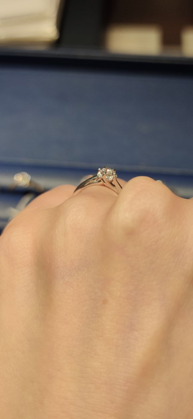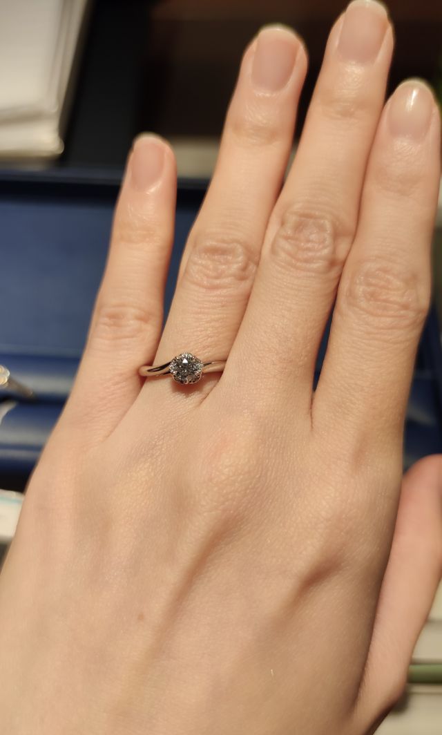 ホームページで見た時から気になっていたデザインでした。花をモチーフにしたデザインで、花びら部分にメレダイヤがあしらわれているタイプなので、センターダイヤがひときわ大きく見え、またより一層輝くように感じられました。