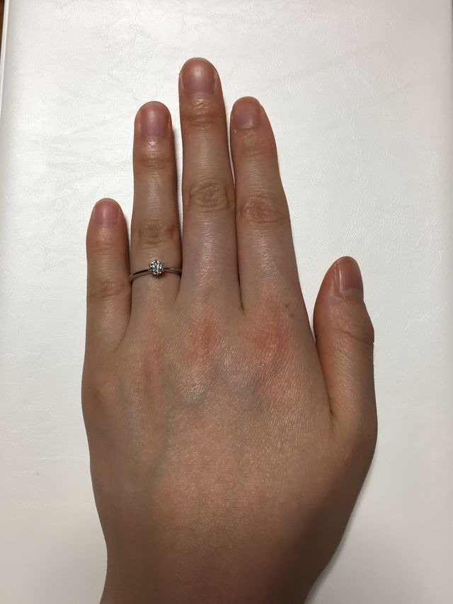 ソリティアに絞って探していました。ソリティアだけでもたくさん種類があり、カーブや太さ、上から見たデザインの違いなどを聞き、たくさん試着した上で、しっくりきたものに決めました。手の形からして、カーブよりまっすぐの方が似合うことや、指が細いので、細いリングでも大丈夫など、アドバイスをいただきました。検討していた他のブランドより、価格が安かったのも決め手です。