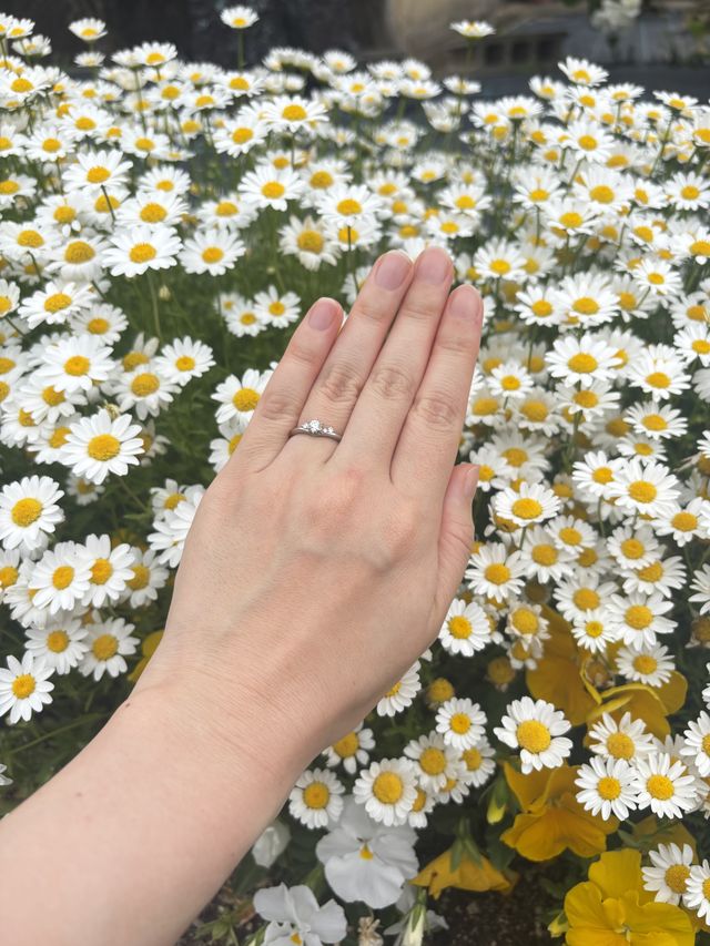 最初、彼がダイヤモンドのみでプロポーズしてくれたため、その後一緒に指輪を選びに行きました。ブランドが売りにしていることもあり、何よりもダイヤモンドの輝きが素晴らしいです。そしてもともと空にかかる天使の梯子が好きだったため、エンジェルラダーという意味付けに惹かれました。メインのダイヤの横に付いた小さなダイヤ3つが、天使の梯子を表現していてとても素敵です。