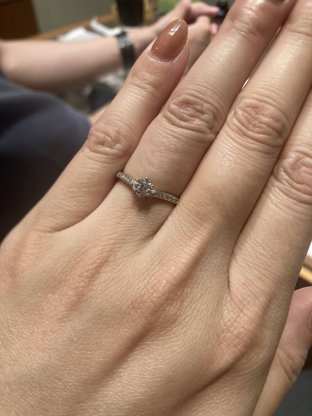 試着する前はシンプルなものが良いと思っていましたが、最初からしぼりすぎずにストレート、ウェーブ、V字とすべて試着させていただき、実はV字で華やかなものが似合うんだと気付きました。選んだ指輪は派手すぎず、でもメレもあって華やかな印象もあり、みるだけでもときめきます。