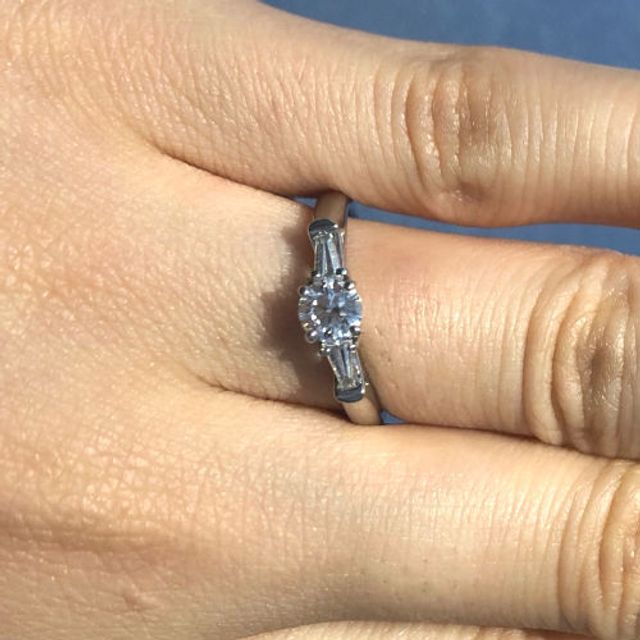 中央のダイヤが大きめでシンプルなラインの指輪を探していましたが、こちらのセンターダイヤのまわりにたくさんの小さなダイヤが付いている指輪が華やかで気に入りました。センターのダイヤは若干小さめですが、まわりにダイヤが付いているため存在感があり、キラキラとしています。