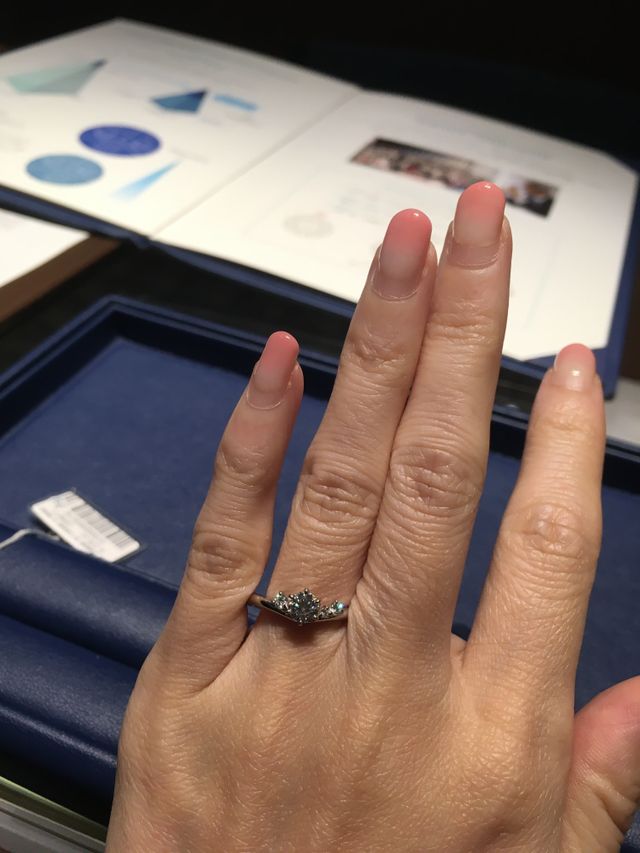 左右非対称のデザインで繊細な感じのリングでした。センターダイヤモンドの美しさだけでなく、周りのメレダイヤも綺麗でした。メレダイヤは大きすぎず、控えめなため、センターダイヤが負けてしまって見えることもありません。
