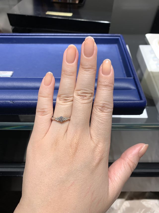 メレダイヤが華やかでセンターのダイヤモンドを引き立てるデザインがとても気に入りました。ダイヤの品質も良く、ボリュームもあり、指の形に合いました。高い台座のデザインは少し苦手だったため、ちょうど良い大きさでした。