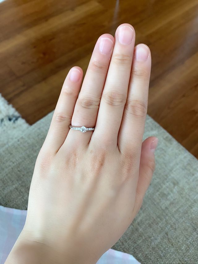 真ん中のダイアモンドの両サイドにも小さいダイアモンドが並んでいるのも華やかで可愛くて、初めからビビッと来ました!