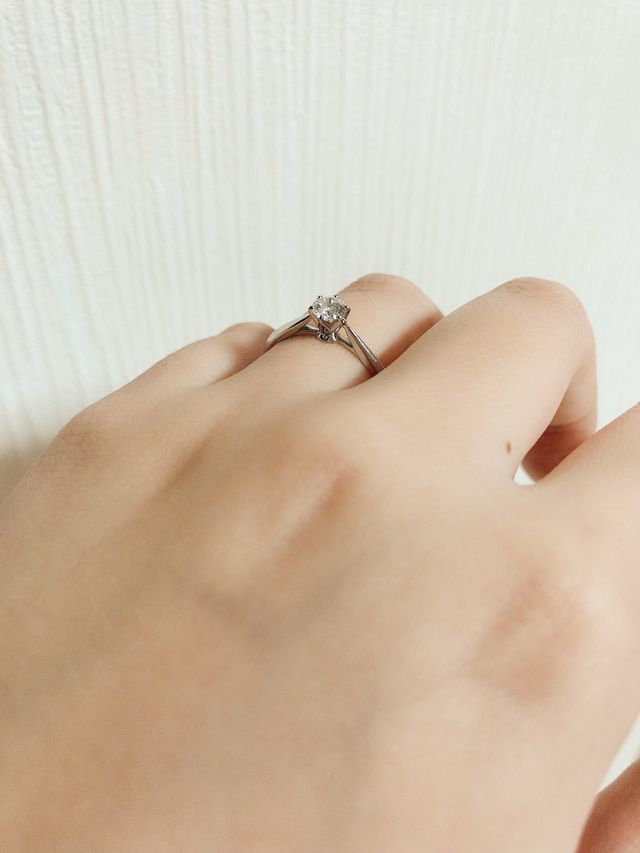 カラット数は、0.25、0.3、0.4で迷いましたが、私の指は少々太めで長いので、0.25だと小さく感じました。