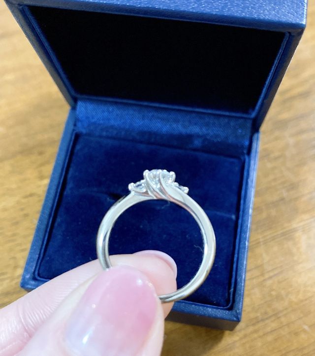 リングのデザインもたくさんありかなり迷いましたが、アームから爪へと向かって描くラインが綺麗で気にいり2時間悩んで決めました。若干のウェーブなので、指輪を装着しているうちに斜めになっていてもあまり目立たなくていいなと思いました。