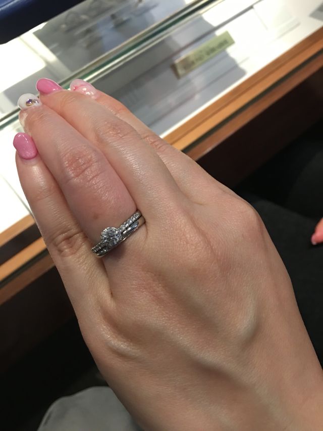 写真では結婚指輪と重ね付けしており、上側が婚約指輪になります。台座部分にダイヤモンドがあしらわれており、中央のダイヤモンドがより映えるデザインに一目惚れしました!また、リングの部分にもダイヤモンドが入っており、全体的に輝きがすごいです!