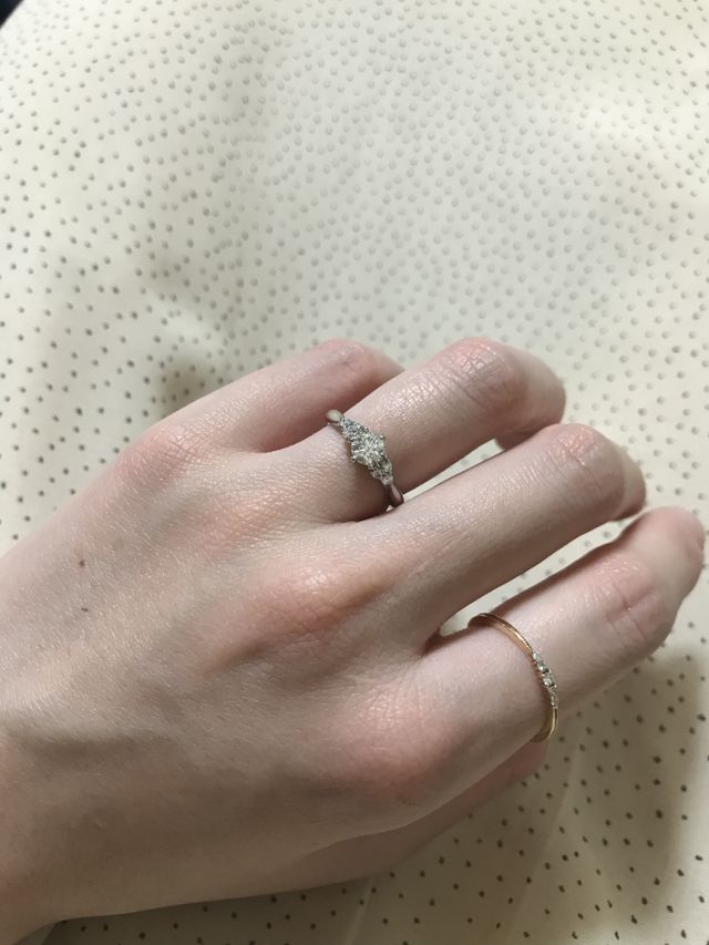 1つ大きなダイアモンド、それを囲むように小さめダイヤがぎゅっとしてるデザインが気に入って選びました。指につけた時に存在感があるのがお気に入りです!反省点は婚約指輪なので、すごくぴったりよりもすこし余裕があるくらいのサイズにしたのですが、少し緩かったらしく、せっかくのデザインが回ってしまうところが反省点です。