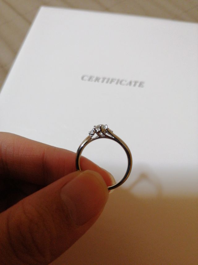 デザインがとてもきれいで、自分の指にもフィットする感じがしました。事前にサイトで調べていたときにはあまりピンと来ませんでしたが、実際につけてみると、ウェーブのデザインで指がきれいに見えます。ダイヤが3連なもの華やかに見えるため、シンプルなものより魅力的でした。