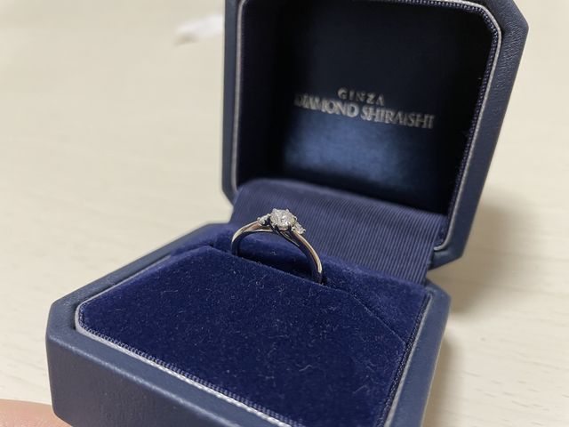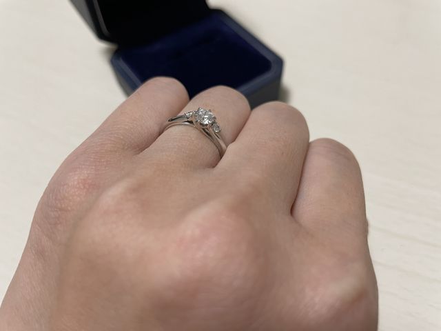 シンプルだけど、ダイヤモンドの存在感があるリングを選びました。リングがウェーブ型なので指が長く見えます。リングは真ん中に大きめ、両サイドに小さめなダイヤモンドがついています。遠くから見ても存在感があり、特にや夜の輝きが綺麗です。