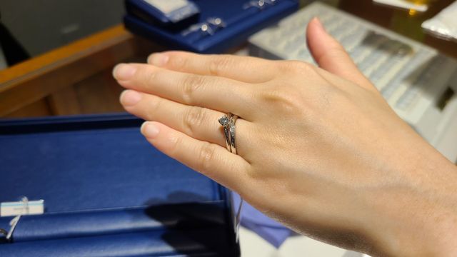 リングが太いと指輪が目立ちすぎてしまうため、少し細めのリングを選びました。また、手をぐっと握ったときに違和感がないかなども選ぶ際のポイントでした。結婚指輪をウェーブで考えているため、その指輪と合うように婚約指輪もややカーブがかったものを選びました。