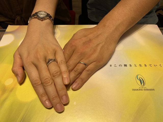 担当者の方と一緒に色々試着しながら、デザイン重視で決めましたが、そこまで大きな金額にならずに安心しました。ダイヤの量や輝きが普段使いにおいて仰々しくなり過ぎないリングを選びました。個人的には名前もお気に入りです。