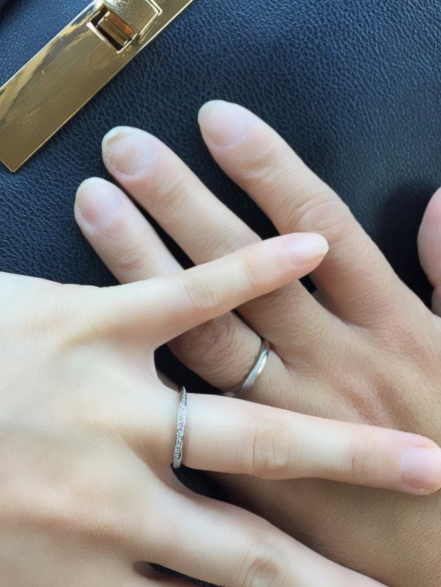 最初は色々な指輪を見て悩みながら選んでいたのですが、シンプルなデザイン尚かつ可愛いデザインが良かったので、この指輪はダイヤの入り方が斜めになっていて、大人っぽいなという印象を持ちました。また、あまり可愛すぎても…と思っていたので、可愛すぎず大人っぽすぎず、見た目が凄く可愛くて、自分も彼も気に入り、この指輪に決めました。