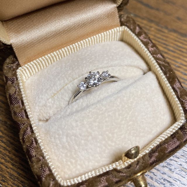 彼が選んでくれたのですが、王道かつ可愛いデザインに惹かれたそうです。上から見るとシンプルですが、横から見るとダイヤモンドの台座部分がハートになっていて、凝ってるなぁと思いました。私も凄く気に入っています。