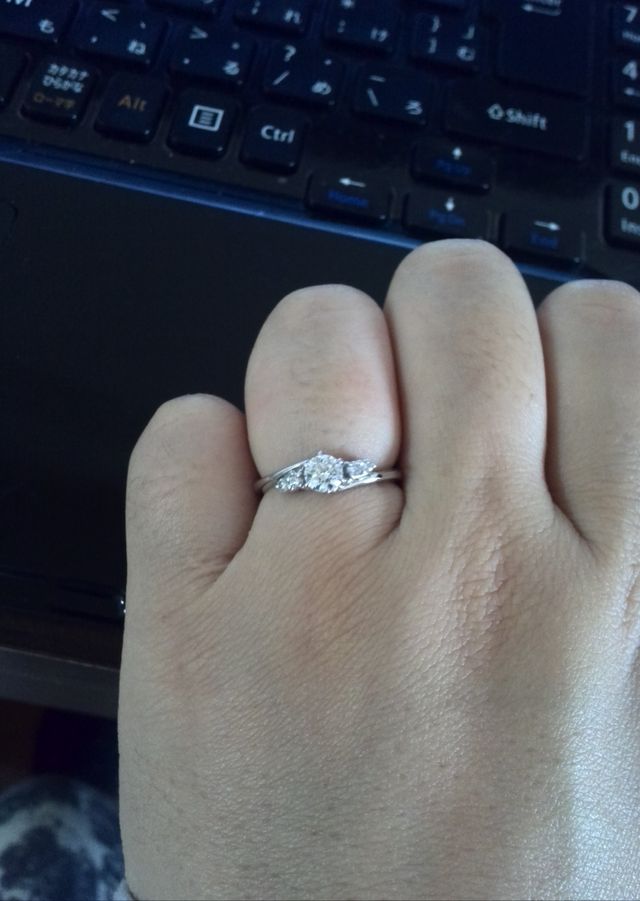 飽きの来ないデザインで、指の短い私でもスッキリと見える形でしたのでとても気に入りました。横に二つずつ付いているメレダイヤはゴージャスな印象を加えてくれ、中心のダイヤとともにキラキラと輝いています。結婚して5年たちますが、指輪を付けるたびにうれしくなります。