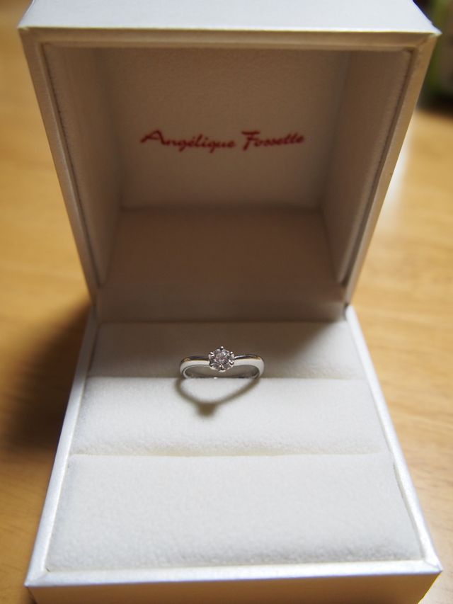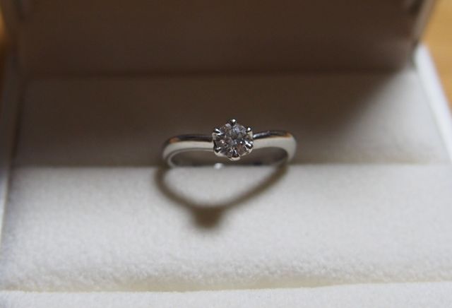 予算の関係で中央にあるダイヤモンドは0.238ctと小さめですが、カット技術が素晴らしいので、光の加減によって実際のカラット数よりもとても大きく見えます。