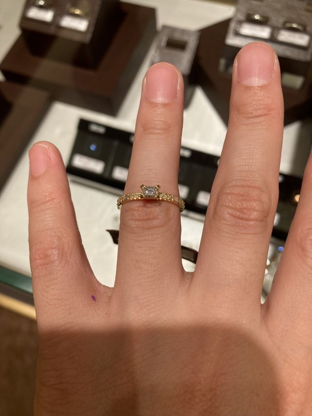 他にはなかなかないエメラルドカットのダイヤを配置した婚約指輪で、サイドにも小さなダイヤが配置されている。いわゆるthe結婚指輪感が薄く、普段使いがしやすいようなデザインで、クラシックな印象の中にもシャープさが感じられるとても素敵なデザインの指輪です。