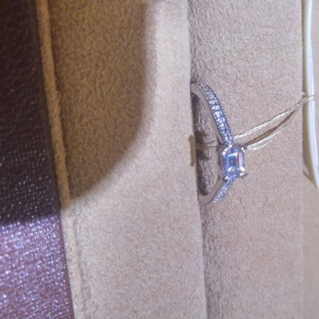 エメラルドカットの上品な輝きが存在感を放つリングです。基本的にシンプルなデザインなので、色々なファッションに合わせやすいと思いますし、耐久性といった面でも安心です。それぞれのダイヤの輝きが他のダイヤにも作用し、輝きが増す点も気に入っています。