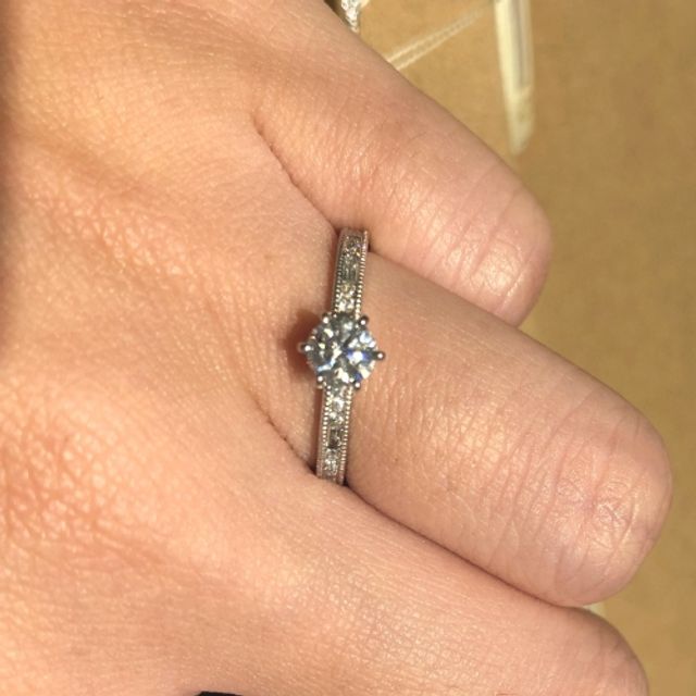 センターのダイヤモンドを引き立てる感じで輝くサイドのダイヤもきれいな印象の指輪であり、思ったよりも上品で気に入りました。本当はエメラルドカットのダイヤを候補にしていたのですが、実際に着けたときにこちらの指輪のほうが合うと思いました。