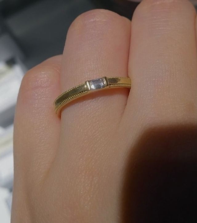 ミル打ちの指輪を探してる時にデザインに惹かれ、店舗に来店し、実際に試着しました。上下にミル打ちがしてあったり、ダイヤが四角いところがデザイン性が高く、気に入りました。全体的にマットでアンティーク感がありました。