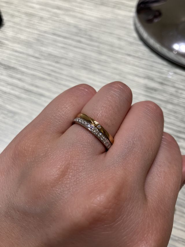 普段つける指輪がゴールドとシルバー両方であり、大きいものをつけることが多いことからシンプルなデザインで両方の色が入った組み合わせで試着しました。普段つける指輪と一緒に試着しましたが、違和感なくごちゃごちゃしすぎなかったので普段からたくさん指輪をつける方にはおすすめです。