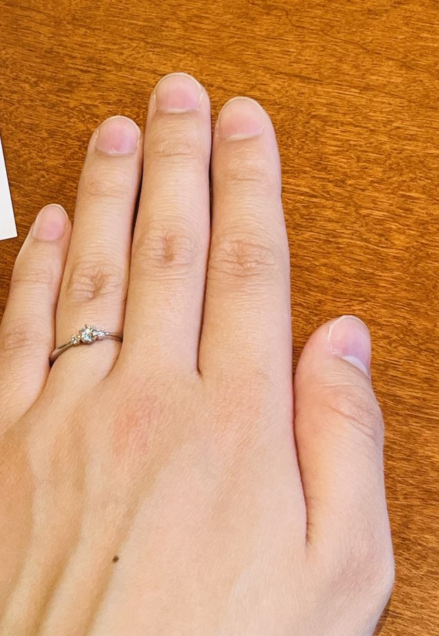 ダイヤの周りが少し細くなっているため、ダイヤが際立つデザインだと思いました。ダイヤが大きすぎず、シンプルなデザインなので、普段から着用できるデザインだと思いました。シンプルなので、結婚指輪とも合わせやすいと思います。