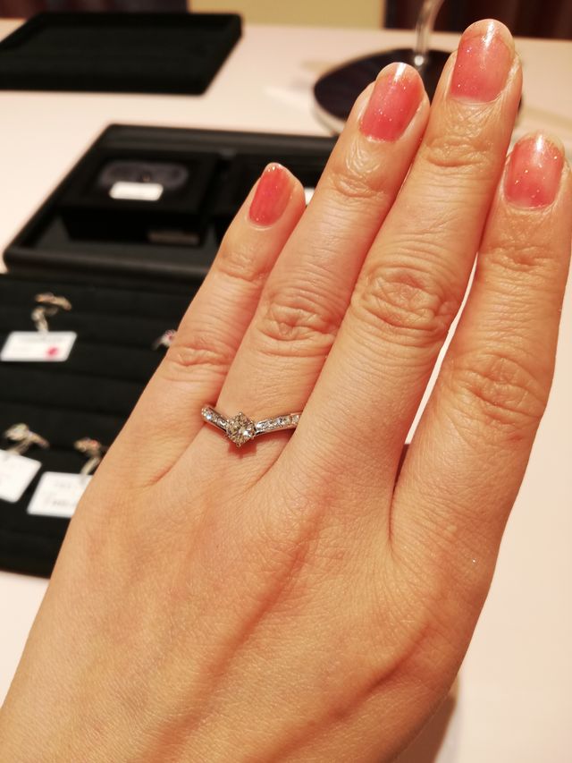 ダイヤモンドを留める爪が小さいので、パヴェ部分の表面も引っ掛かりがなく滑らかです。例えダイヤが取れてもアフターサービスがあるので安心。リングの素材も形も独自の内甲丸だそうで、着け心地がとても良いです。大きいカラットは無さそうですが、説明を聞く限り、ダイヤの質も満足しています。
