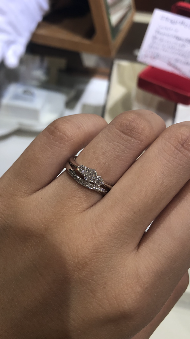 ダイヤが3つ並んで、手に馴染むS字ウェーブが決め手でした。可愛いだけでなくきれいめな印象のあるデザインなので若いうちだけでなく、これから長く着けることができると思っています。ダイヤもとっても気に入ったものを見つけていただけました。