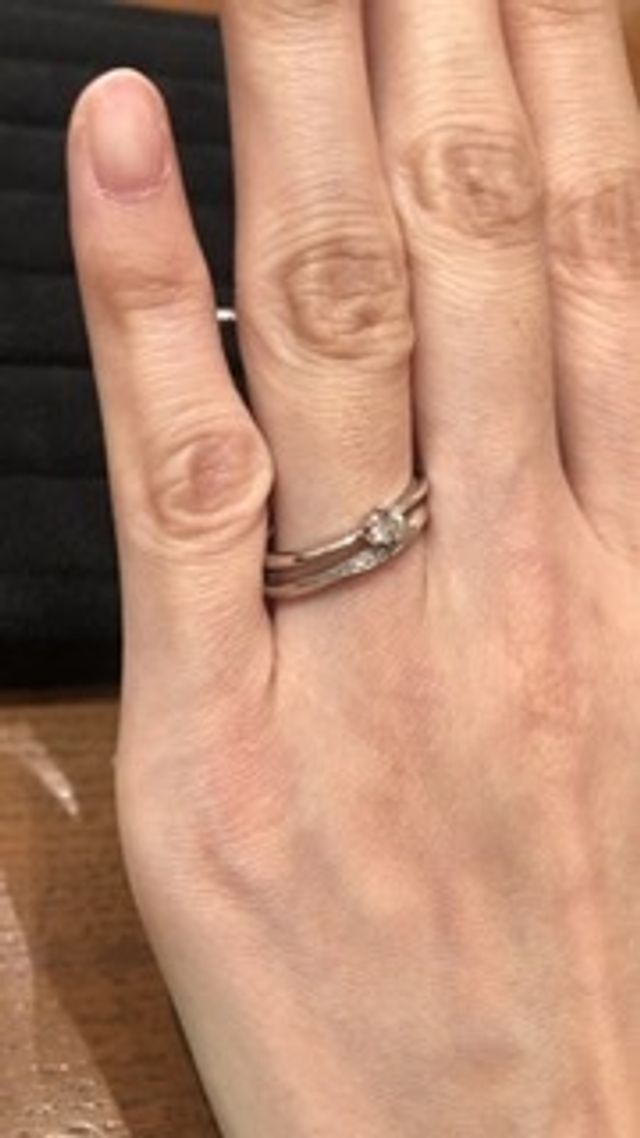 細身のデザインで、指が細長くキレイに見えたのか良かったです。ダイヤもスコープで見させてもらいましたが、店内の暖色系のライトの下でもキレイに輝いていたのが印象的です。重ね合わせてもピッタリとフィットして華やかに見えるのが良いと思いました。