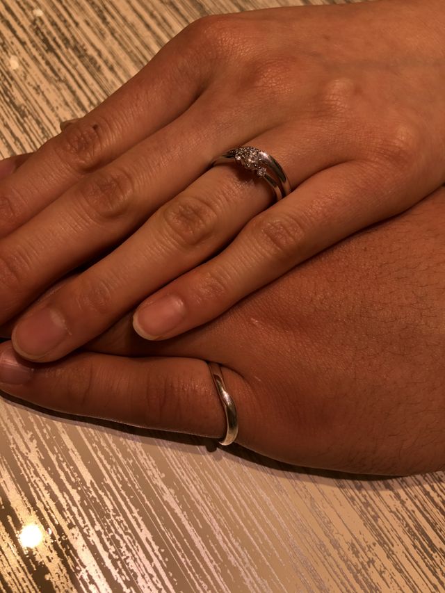 トレセンテさんの細身のデザインでウェーブの指輪がとても綺麗でした。重ね付けもとてもピッタリで綺麗でした。婚約指輪のダイヤモンドもとても綺麗なものでした。ダイヤモンドの説明もとても丁寧なもの分かりやすかったです。