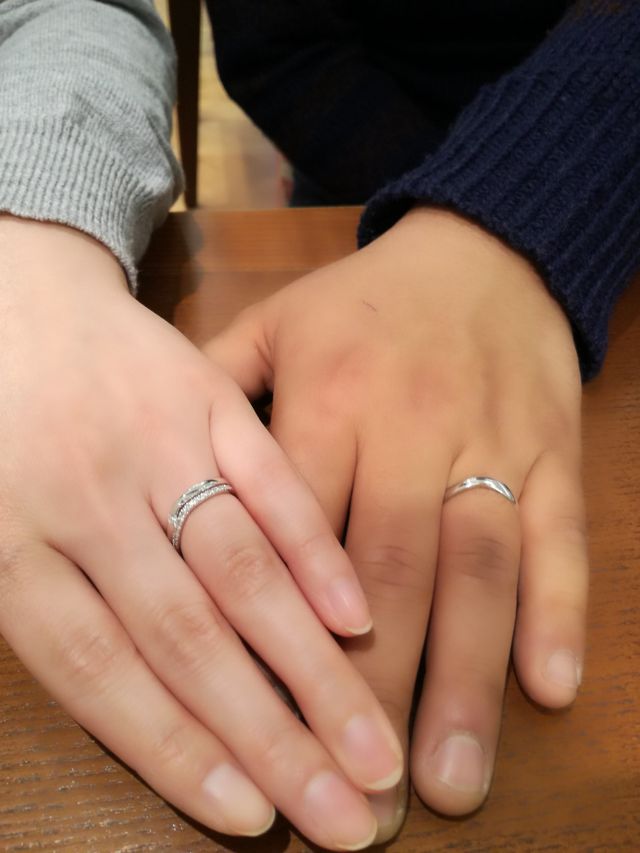 指が長くみえるのがウェーブ型の特徴で、指輪は少し太めでしっかりしているのに、ゴツい感じに見えないところが気に入りました。