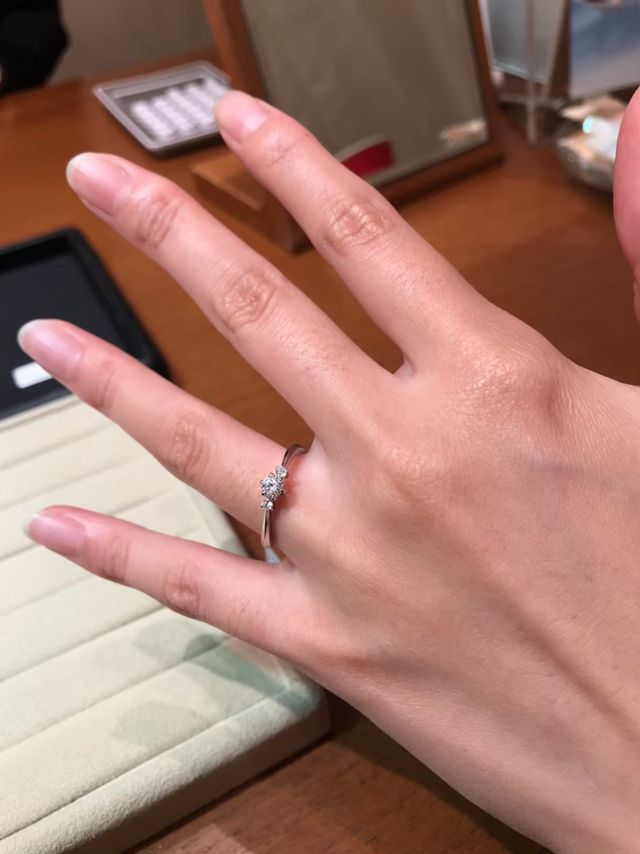 上品でかわいらしいデザインでした。リングの内側部分に丸みを持たせる「内甲丸」というデザインのおかげで、とても着け心地が良く、指馴染みが良かったです。メインのダイヤモンドもですが、両サイドのダイヤモンドの輝きもとても綺麗でした。