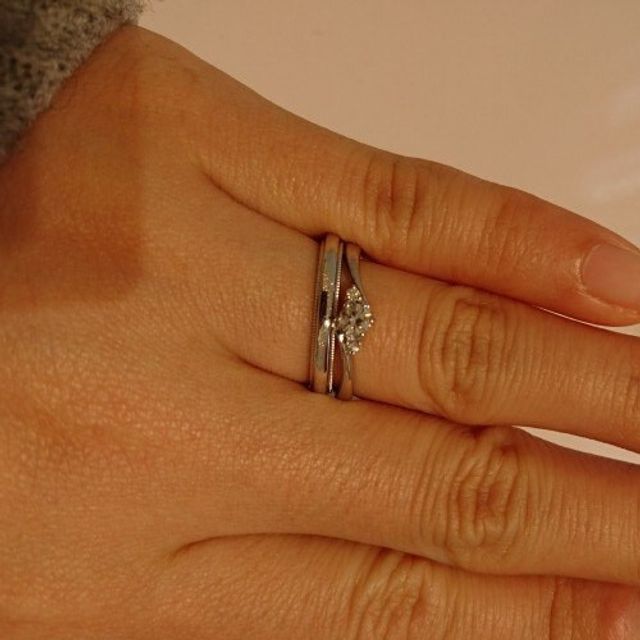 まずエンゲージリングを選び、セットで着けた際の印象を重視してマリッジリングを選びました。エンゲージリングはデザイン性によりセンターのダイヤモンドが大きく見える点やサイドのウェーブ状のフォルムが気に入りました。マリッジリングはミル打ちが上品な印象ですね。