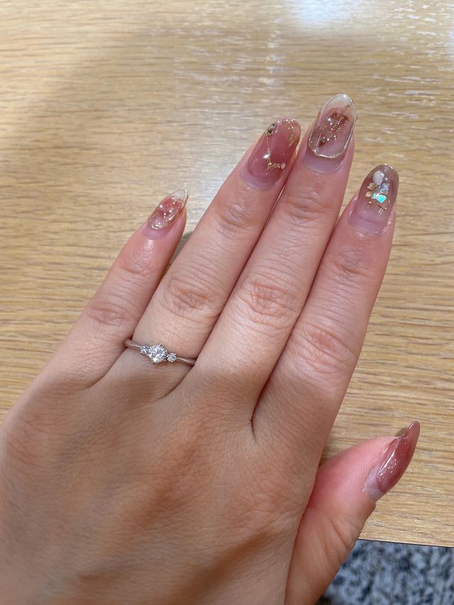 ダイヤモンドが3点付いているので、とても華やかで可愛いと思いました。また、リング部分がダイヤモンドに向かって細くなっているデザインも可愛かったです。着け心地にもこだわっているとのことで、快適に着けることができました。