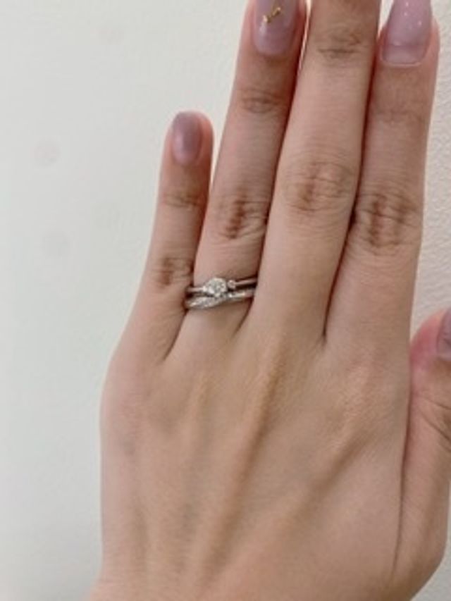 3連ダイヤがとても可愛く一目惚れでした。なかなかないデザインで、派手すぎないけれど華やかに見える点がとても良かったです。指も長く綺麗に見えてとてもお気に入りです。リングも太すぎず細すぎずで華奢に見える点もよかったです。