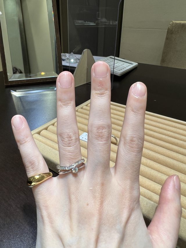 シンプルなデザイン性で指輪のハメ心地が他のブランドにくらべるとはめたときのフィット感が全然違う感じがして、はめてるような感覚が全くなく、他のブランドにはない心地いい素材感でした。ダイヤモンドも品質も価格の割に良かった。