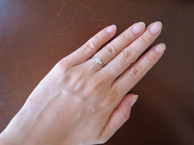 オーソドックスなデザインの婚約指輪を探していましたが、指が短いためストレートタイプの大粒ダイヤは似合いませんでした。試着する中で、小粒のダイヤで少しウェーブしたデザインの方が手にしっくり馴染むことがわかり、こちらのデザインに決めました。0.2カラットと小粒なため1粒だけだと寂しかったので、左右に0.05カラットのダイヤが配置されているものを選びました。中央のダイヤが主張しすぎず、カジュアルめなお洋服とも合いますので、ちょっとしたお出かけにも気軽につけられるのが嬉しいです。
