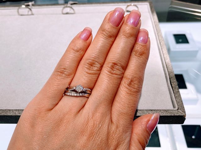 結婚指輪は、緩やかなウェーブにメレダイヤが付いていて、華やかですが派手すぎないデザインです。婚約指輪は、センターダイヤの両サイドに星形でメレダイヤ、さらに流れるようなメレダイヤと、とても華やかです。結婚指輪だけならシンプルに、婚約指輪とセットでつけたら華やかに特別感を味わうことができる素敵なセットリングでした。