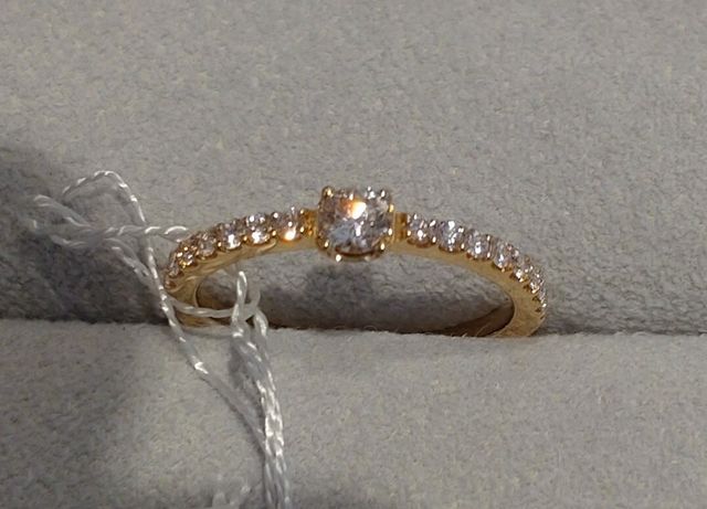 幅が細いので指が華奢に見える。真ん中の大きめのダイヤと取り囲むハーフエタニティのようなデザインのダイヤの輝きがとても素敵だった。凄い存在感があるわけではないが、あまり見ないデザインでダイヤの大きさなど、とても上品に見える。