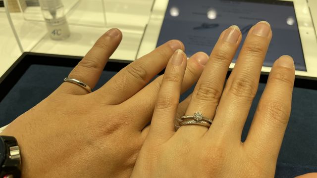 婚約指輪も結婚指輪も多くのメレダイヤが斜めに埋め込まれているデザインが素敵で、どの角度から見ても輝きがあるのがとても良かったです。また、婚約指輪のダイヤモンドの箇所が横から見た時にとても綺麗に見えるのも印象的でした。