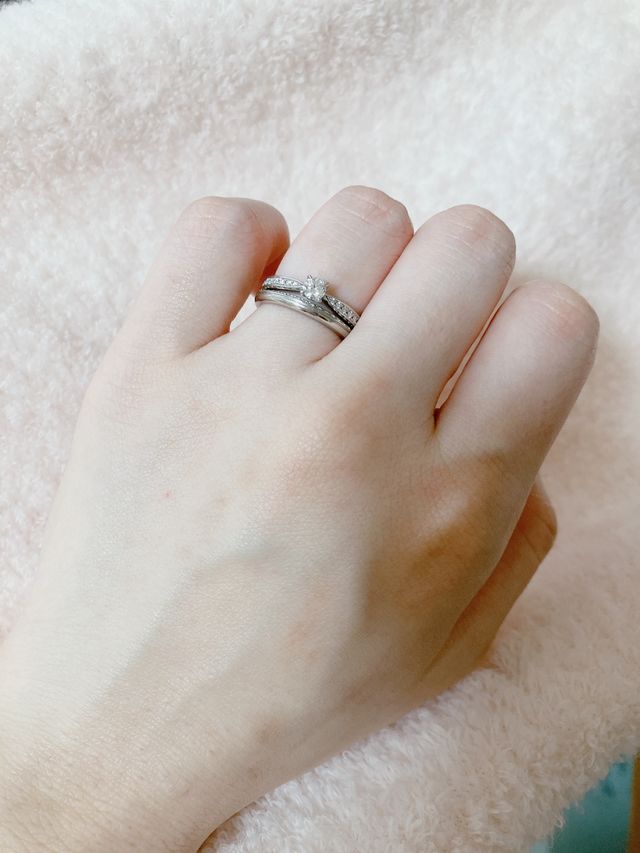 結婚指輪はシンプルでも寂しくないデザインを探していて、夫が贈ってくれた婚約指輪とセットになっていたリングが希望にぴったりだったため、そちらに決めました。素材やダイヤの加工にもこだわりがあり、とても気に入っています。