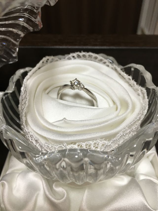こちらの婚約指輪はシンプルだけど、大小のダイヤが2つついていてとてもかわいらしいところが気に入りました。また、リングの部分はウェーブになっていて指が細長く見えるような作りになので、関節が太めの私には嬉しい工夫でした。