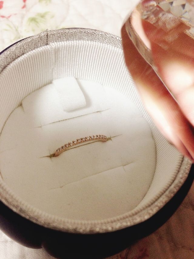 結婚後も使用したかったので、特別高価ではないものにしました。ピンクゴールドがいいとカラーは決めていて、普段使い出来るもの、派手ではないデザイン、可愛すぎず、と決めていました。ただしせっかく婚約指輪にするので、18金のものにしました。