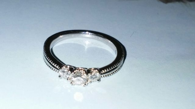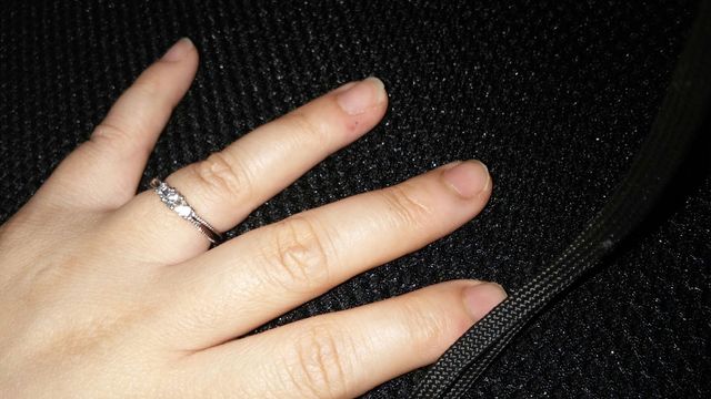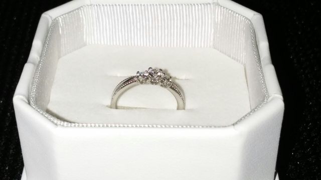 彼の予算があまりなかったため、大きなダイヤにはできませんでした。しかしこの指輪はセンターストーンの横に小さなダイヤが二つ付いているため、0.2Cでも石の存在感がはっきりきらびやかに見える点とマリッジリングとの重ね付けの相性がとてもよかったのが決めてでした。