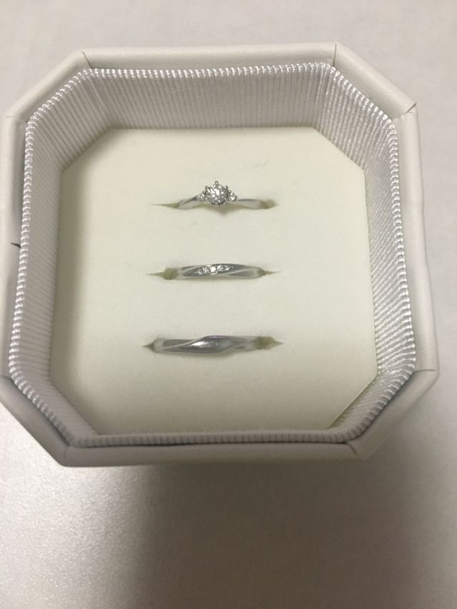 友人の結婚式など、結婚したあとでも重ね付けできるように、婚約指輪もウェーブの入ったものを選びました。