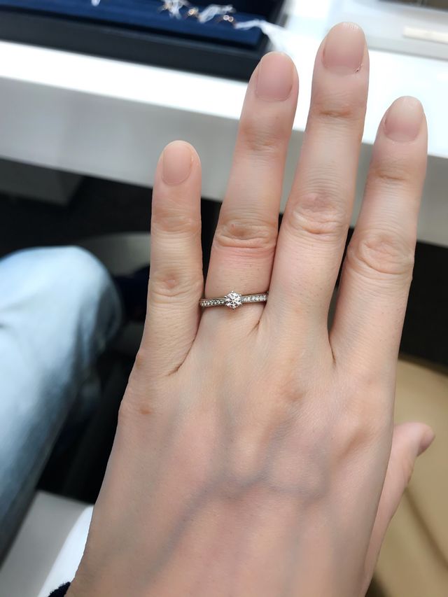 インターネットで確認し、気に入っていたデザインだったため、試着したいと言うとすぐに出していただけた。細身のアームに沢山ダイヤが付いていて、華やかな雰囲気なのが気に入ったのと、センターダイヤが存在感があるところも気品があると思った。