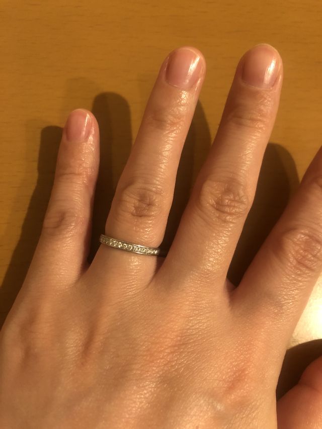 結婚指輪はずっとつけるものなので、後悔したくないと思い、いろんなお店をまわりました。4℃は、ダイヤが外れてしまっても無償で保証がついていたりとアフターフォローがしっかりしていたのと、自分の指に一番しっくりきたので決めました。